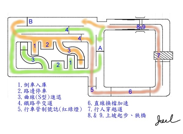 8.上坡起步 上坡到一半要你拉手剎車停車,而且前輪要停在兩橫條記號線之間,接著不熄火、不下滑,能直接往前開走。