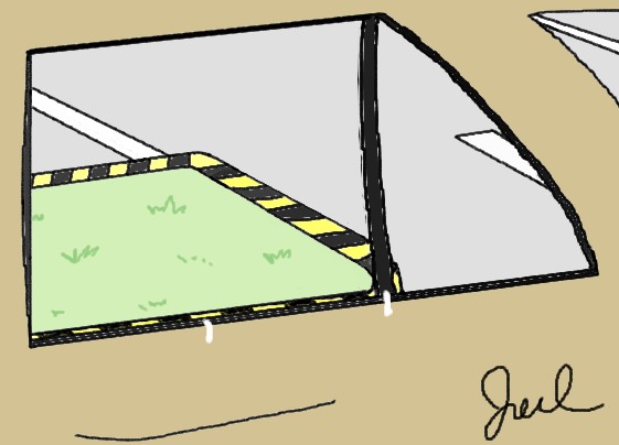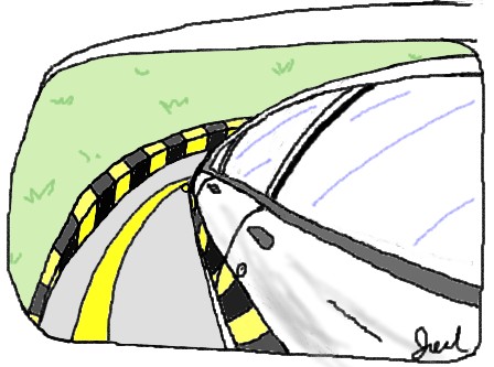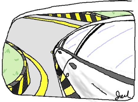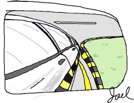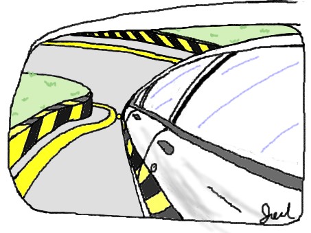 4.持續倒退並盯著鏡中車尾小黃燈,讓它沿著左側邊線彎,直到邊線轉折,小黃燈一脫離邊線後(如下圖),左轉一圈半。